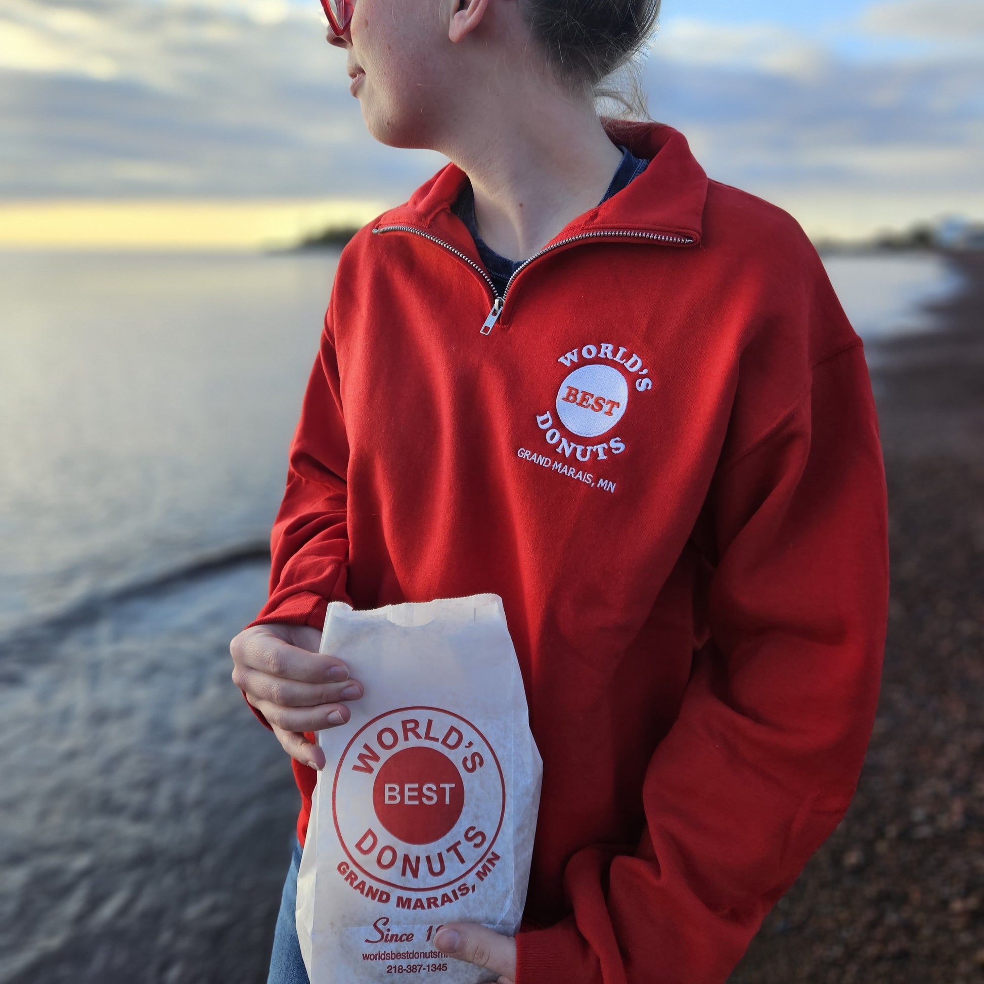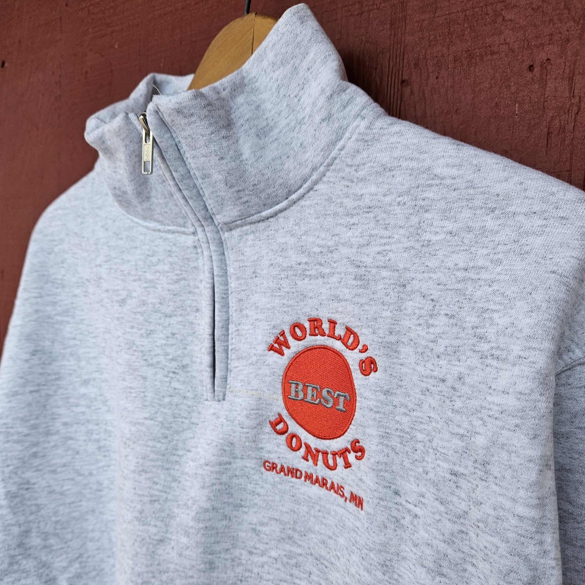 Soft and cozy World's Best Donuts 1/4 zip red or heather gray sweatshirt with logo embroidery.