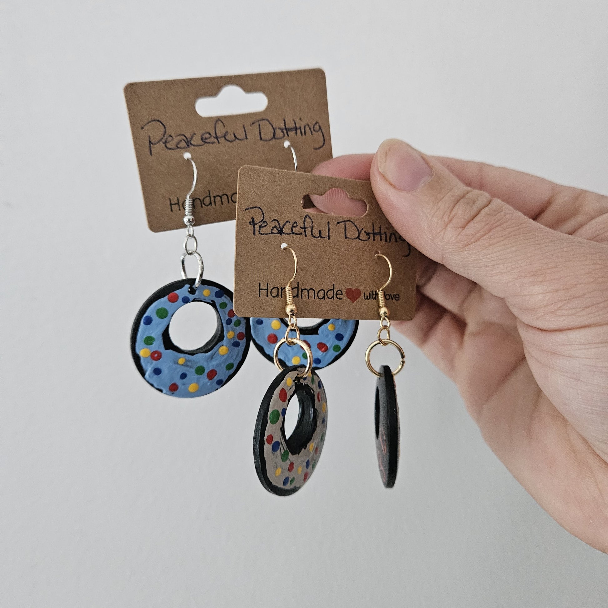 Colorful handpainted wood donut earrings by Peaceful Dotting
