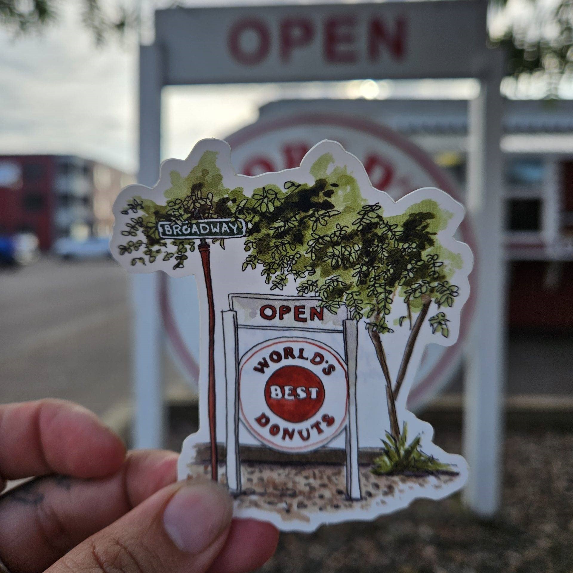 A 3.3″ x 2.9″ vinyl and waterproof sticker featuring the World’s Best Donuts ‘Open Sign.’